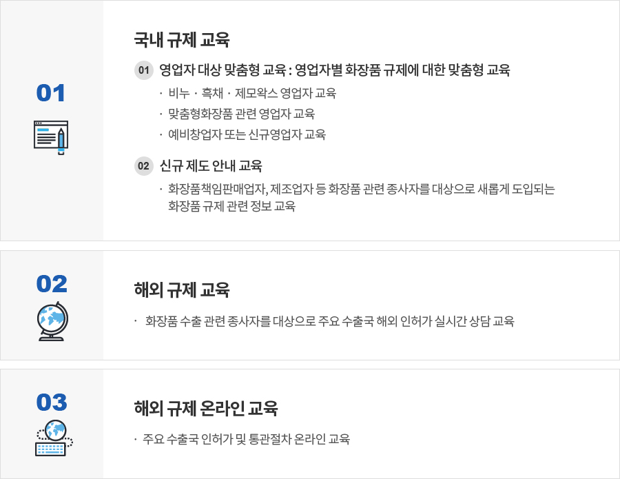 인사말 ICCR 개요 토픽 및 문서 교육안내 국내 규제 교육 신청 해외 규제 교육 신청 교육자료실 국내법령 화장품 법령 민원인안내서 기타 관련 법령 중국법령 시행중인 법령 입법/행정예고 해외법령 시행중인 법령 입법/행정예고 TBT통보문 세계법제정보센터 인허가 대행사 명단 해외 규정 요약 자료집 해외 동향 정보지 국내외 원료 규제정보 정부지원사업안내 AI 코스봇 시나리오 챗봇 자주하는 질문 참고 자료집 교육안내 > 교육 > 교육안내 교육 개요 교육 대상 교육 신청 절차
